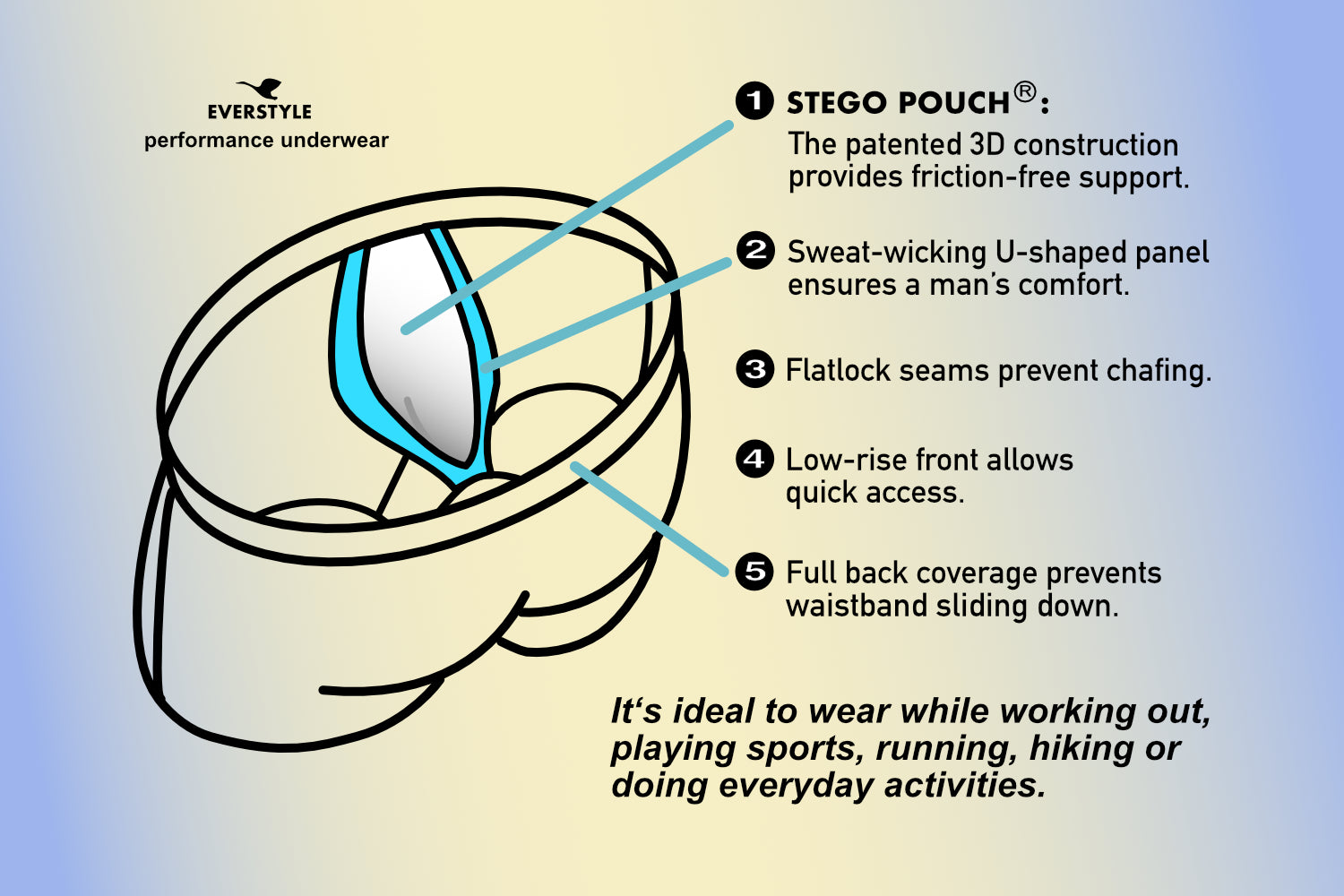 这种内部技术提供完全自然的支持,允许自由活动,保持皮肤凉爽,防止胯部出汗,全天候保护。